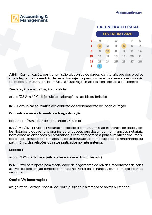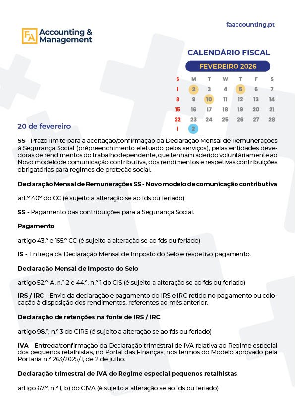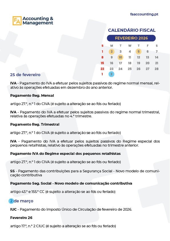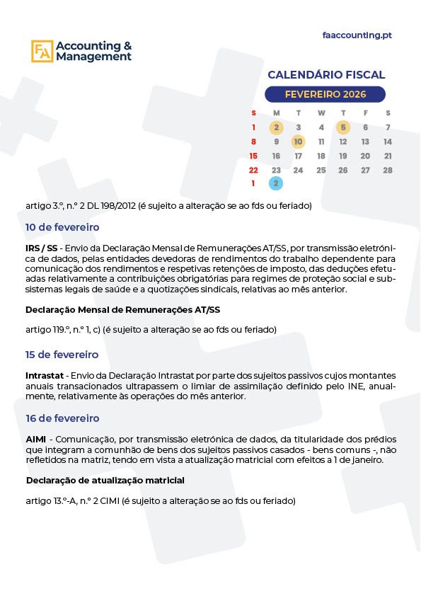 CALENDÁRIO FISCAL – FEVEREIRO 2026